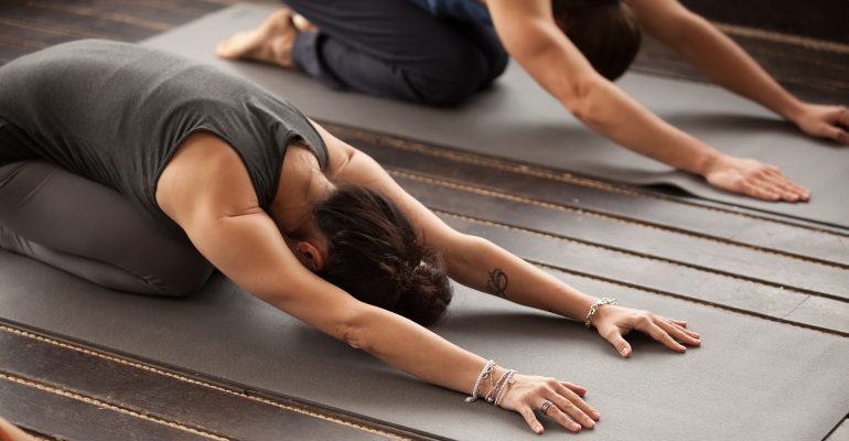 - Balasana (posizione del bambino): permette di rilassarsi nel profondo, stando seduti sui talloni, con il busto in avanti e la testa che tocca il tappetino, liberando le tensioni lungo schiena, spalle e collo.